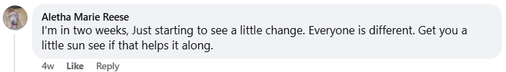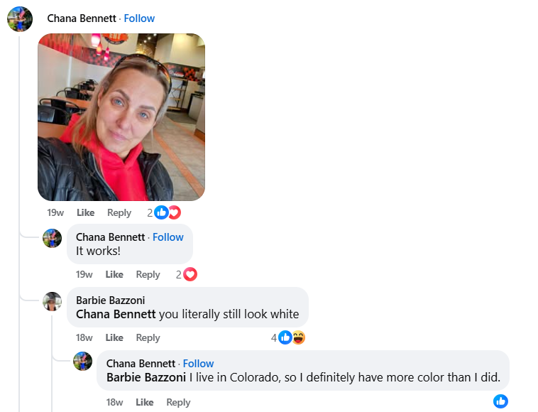 You'll notice a subtle shift in skin tone (visible in certain lighting). Your skin appears warmer and less dull, especially on your face, neck, and chest.